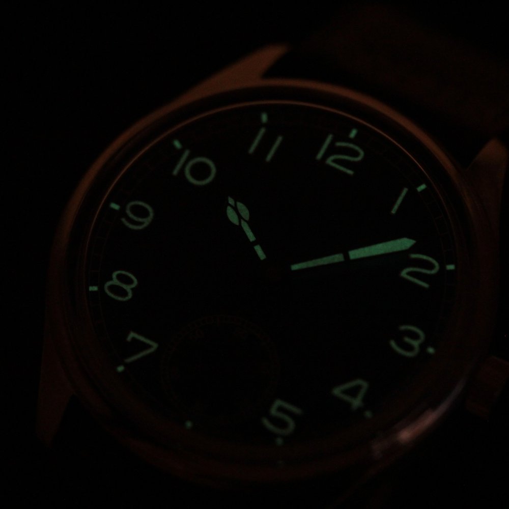 リサイクルしたスイス製手巻き式ムーブメント、ユニタス6498を採用しており、レトロなアラビア数字文字盤、コブラ針の組み合わせ。6時方向にはスモールセコンドを配置。シースルーバック仕様になっており、裏面には1960年代より現在も変わらず生産され続ける、ユニタス6498ムーブメントを見ることが可能。