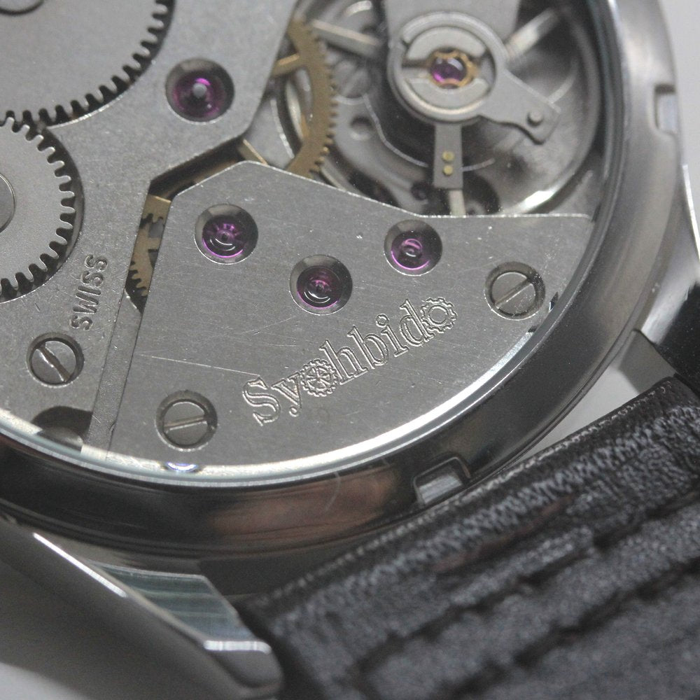 よくある「ブランドロゴ」は一切文字盤になく、シンプルな時計に仕上がっております。ムーブメントには正美堂時計店で組み立てた証としてロゴが刻印されております。