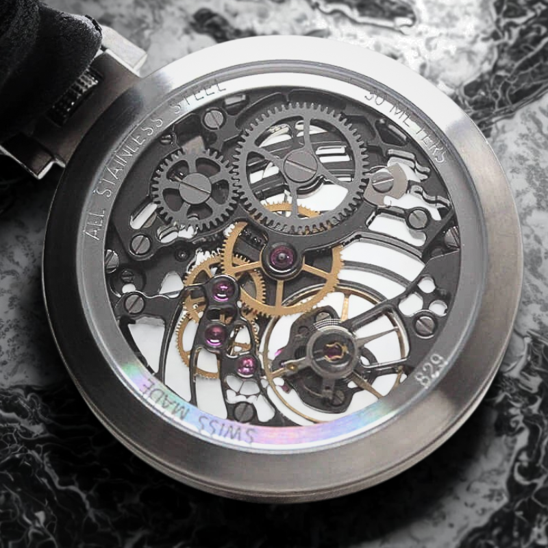 ゼンマイの動力を使って動く「手巻き(機械)式」懐中時計。中の機械を魅せるスケルトンやオープンハートなど懐中時計の魅力を伝えるデザインが多いのが特徴です。