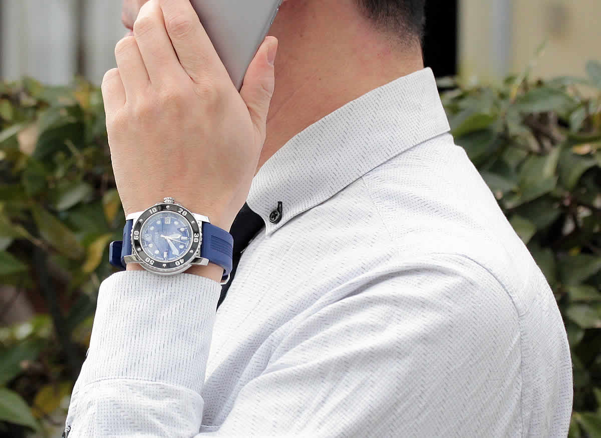光沢のある深みのブルーが艶っぽい、大人の男性に似合うダイバーズウォッチ。エレガントな装いにも似合います。