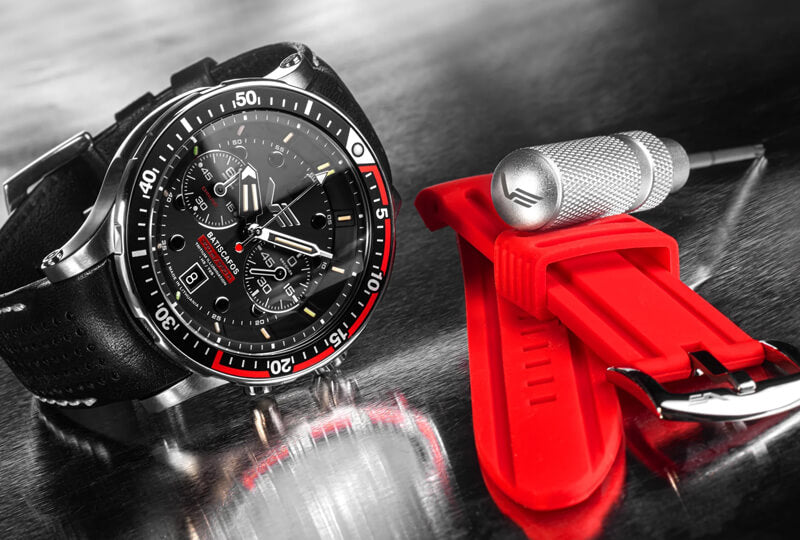 シリコンベルトの他に、レザータイプのベルトも付属。また工具もセットになっているので、その日の気分に合わせてベルトを交換することが可能です。