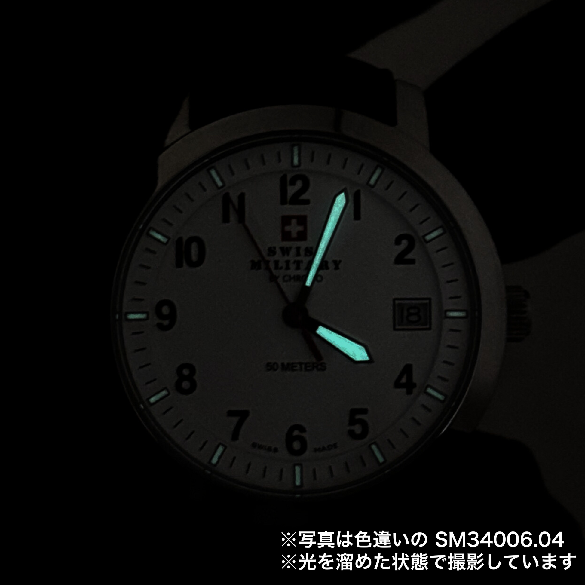 インデックスと針には蓄光塗料が塗布されており、暗闇でもグリーンに光ります。