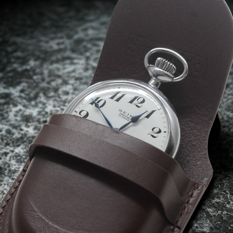 当店オリジナルの、外出時に便利な懐中時計専用レザーケースがついに出来上がりました。