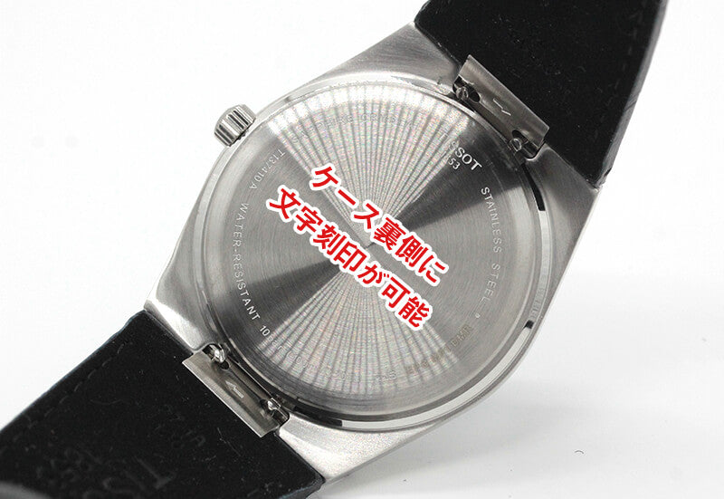 こちらの腕時計の裏ぶたに当店オリジナルの文字入れ刻印が可能。
