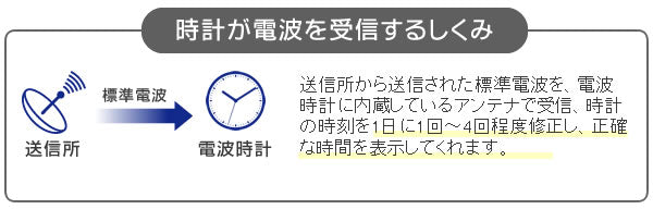 正確な時刻情報やカレンダー情報をのせた標準電波を受信することにより、常に正しい日本標準時刻に自動修正する時計です。