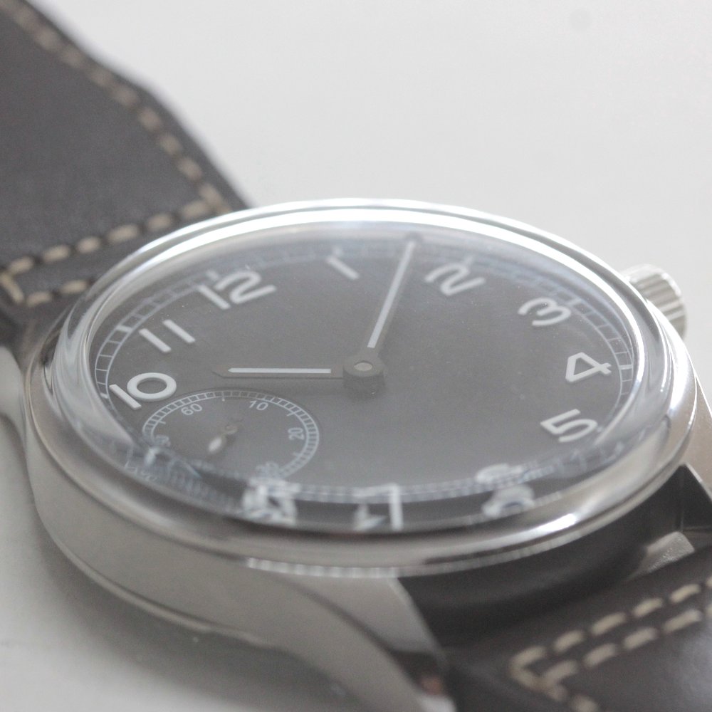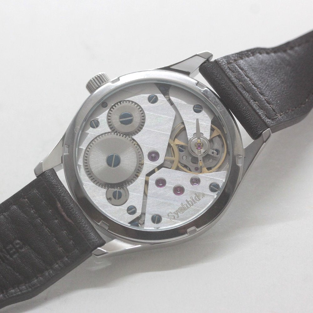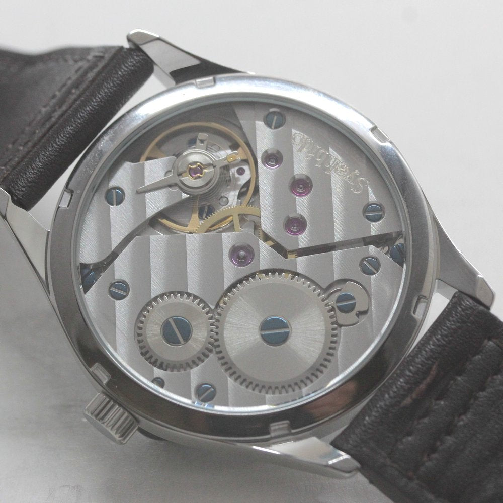 スイス製手巻き式ムーブメントを採用しており、レトロなアラビア数字文字盤、シンプルなペンシル針の組み合わせ。9時方向にはスモールセコンドを配置。シースルーバック仕様になっており、裏面はコート・ド・ジュネーブ仕上げ(スイス縞模様)が美しいムーブメントをご覧いただけます。