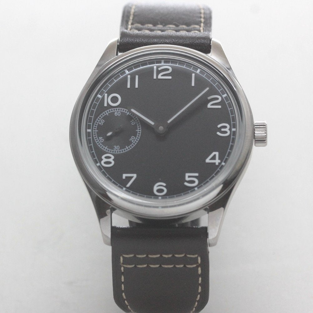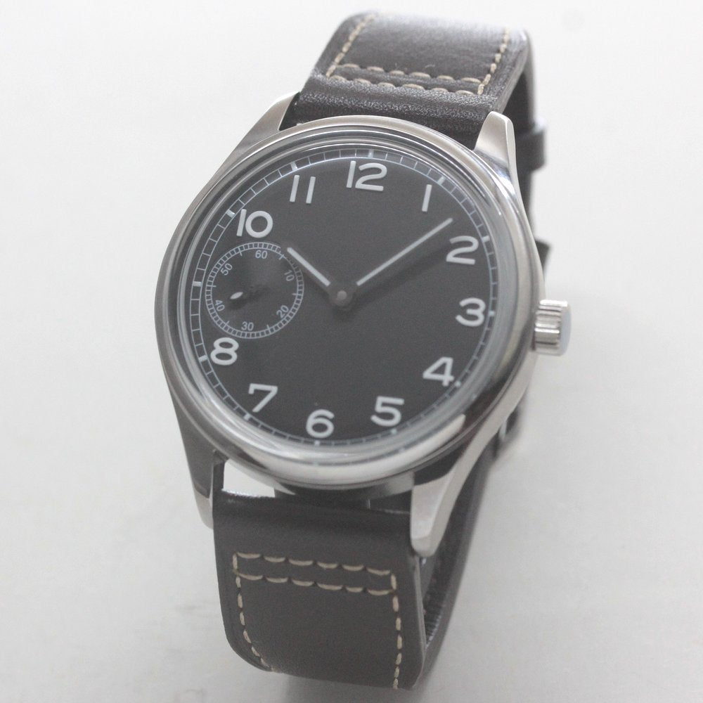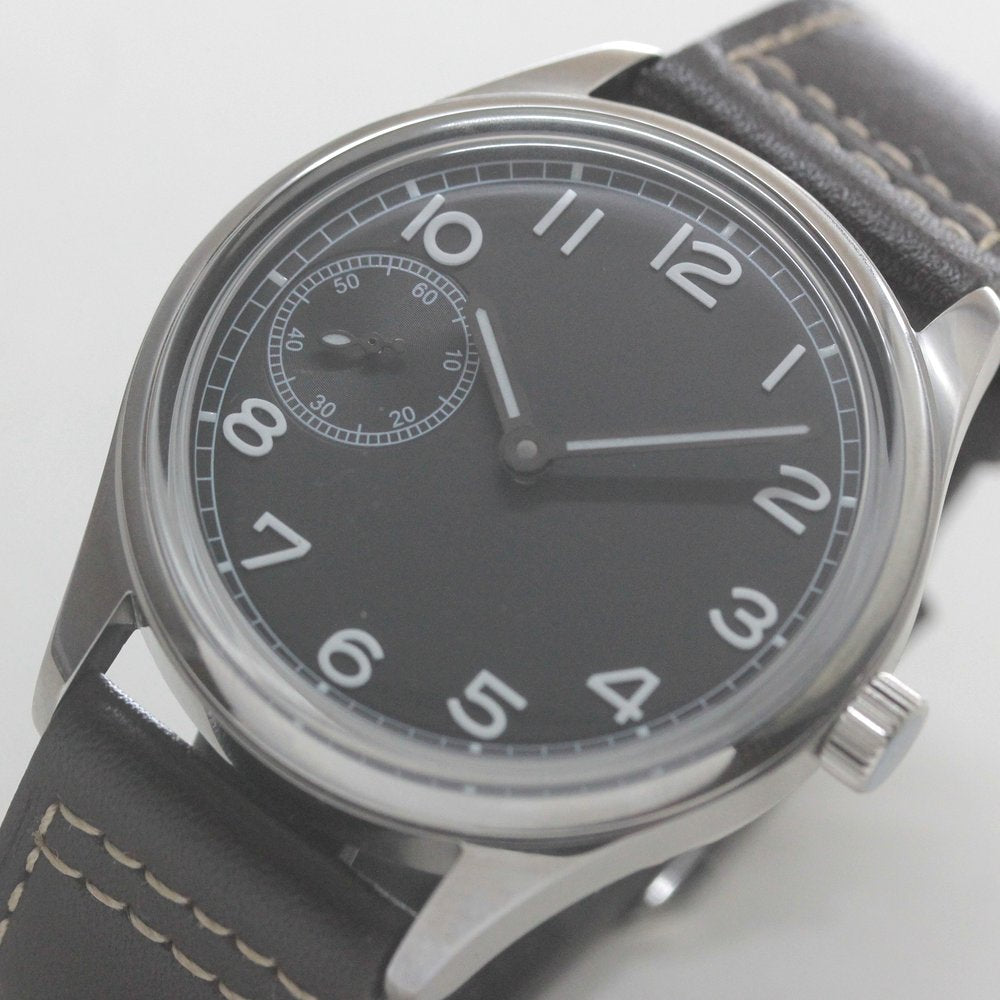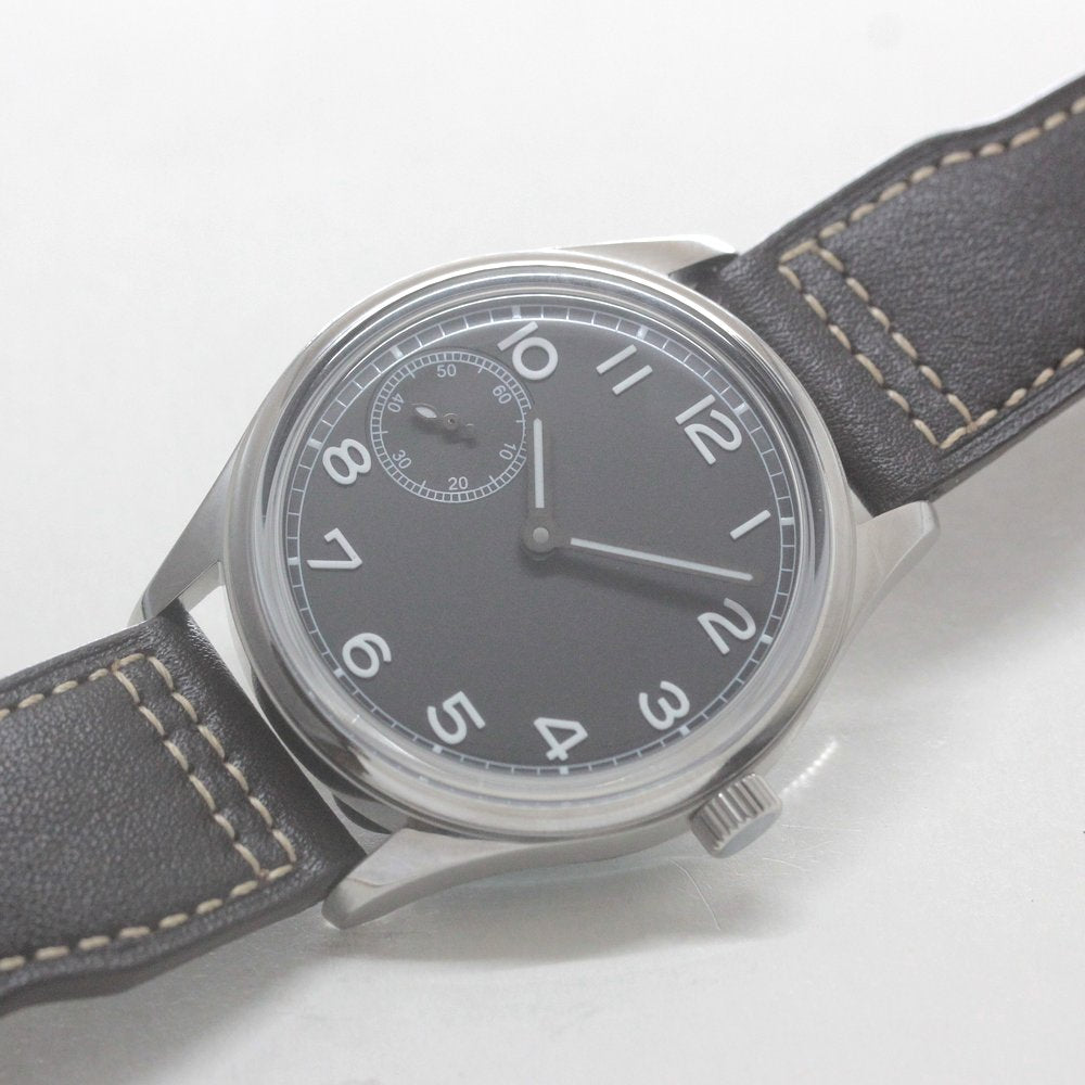 スイス製手巻き式ムーブメントを採用しており、レトロなアラビア数字文字盤、シンプルなペンシル針の組み合わせ。9時方向にはスモールセコンドを配置。シースルーバック仕様になっており、裏面はコート・ド・ジュネーブ仕上げ(スイス縞模様)が美しいムーブメントをご覧いただけます。