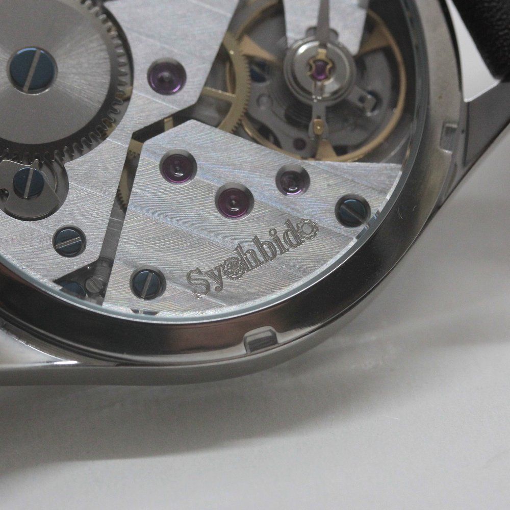 よくある「ブランドロゴ」は一切文字盤になく、シンプルな時計に仕上がっております。ムーブメントには正美堂時計店で組み立てた証としてロゴが刻印されております。