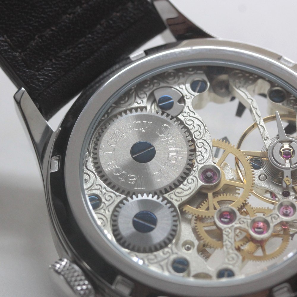 よくある「ブランドロゴ」は一切文字盤になく、スケルトンムーブメントの美しさ、音手応えを五感でお楽しみいただけます。