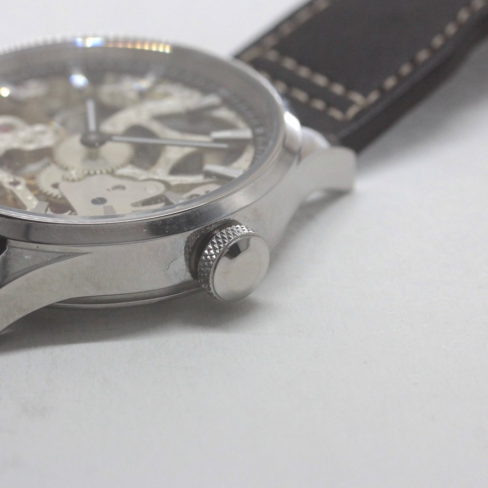 表面にブランド表記はなく、機械式時計らしさをお楽しみいただけるスケルトン仕様となっております。アフターケアは全て当店で行いますので安心してお任せください。