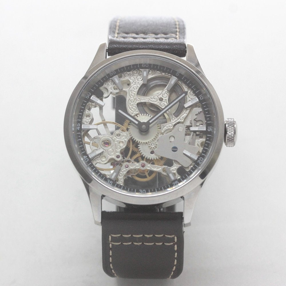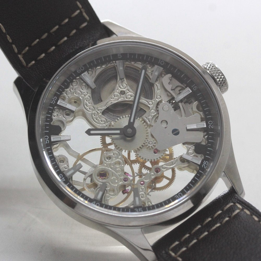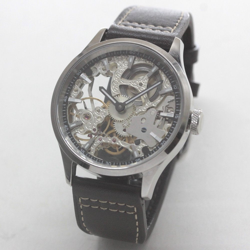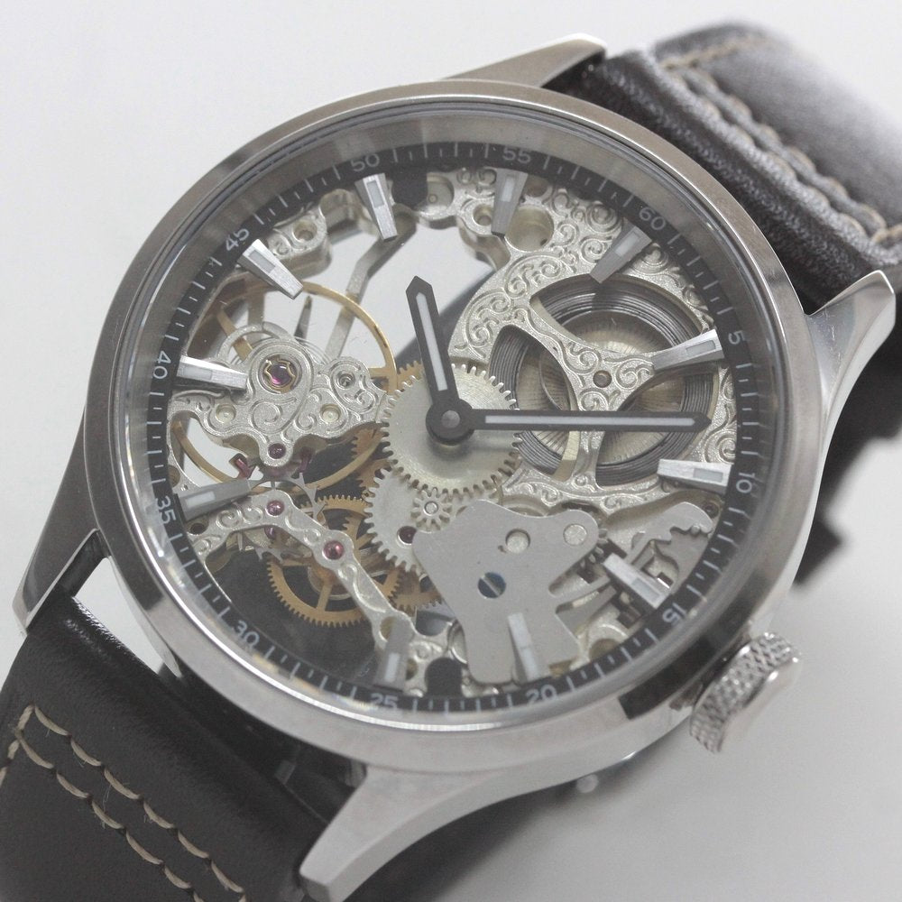 スイスムーブメントの機械の動きを見ることができる、スケルトンウォッチ仕様