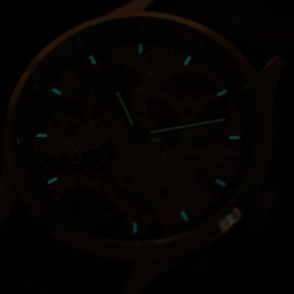 文字盤と針にはルミノバが塗布されており、太陽光や蛍光灯など明るい場所で蓄光し、暗いところで発光する、実用的な機能が備わっています。