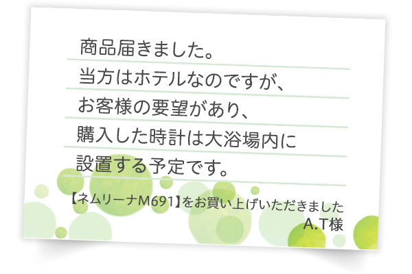 A.申し訳ありません。あいにくサウナ等50℃以上の環境で使用可能な掛け時計は、シチズン、セイコー共に未だ生産されておりません。