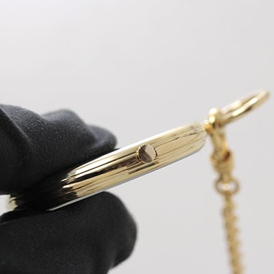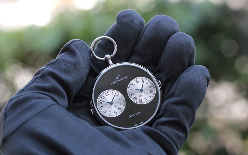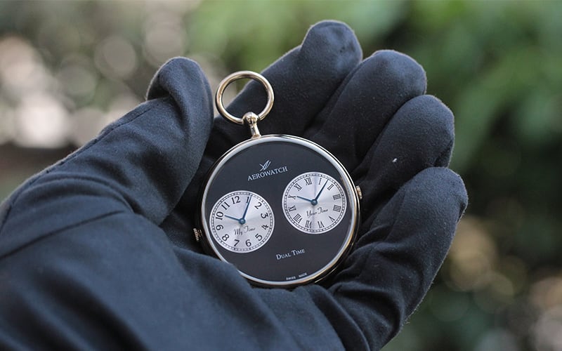 二つの時間を同時に表示するデュアルタイム懐中時計。外国にいらっしゃる場合など、相手先の時刻に合わせておくと連絡の際にいろいろと便利になります。