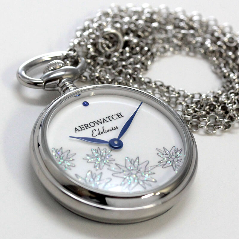 ホワイトの文字盤に散りばめられたエーデルワイスの花が印象的な、AERO(アエロ) ペンダントウォッチ 「Edelweiss」