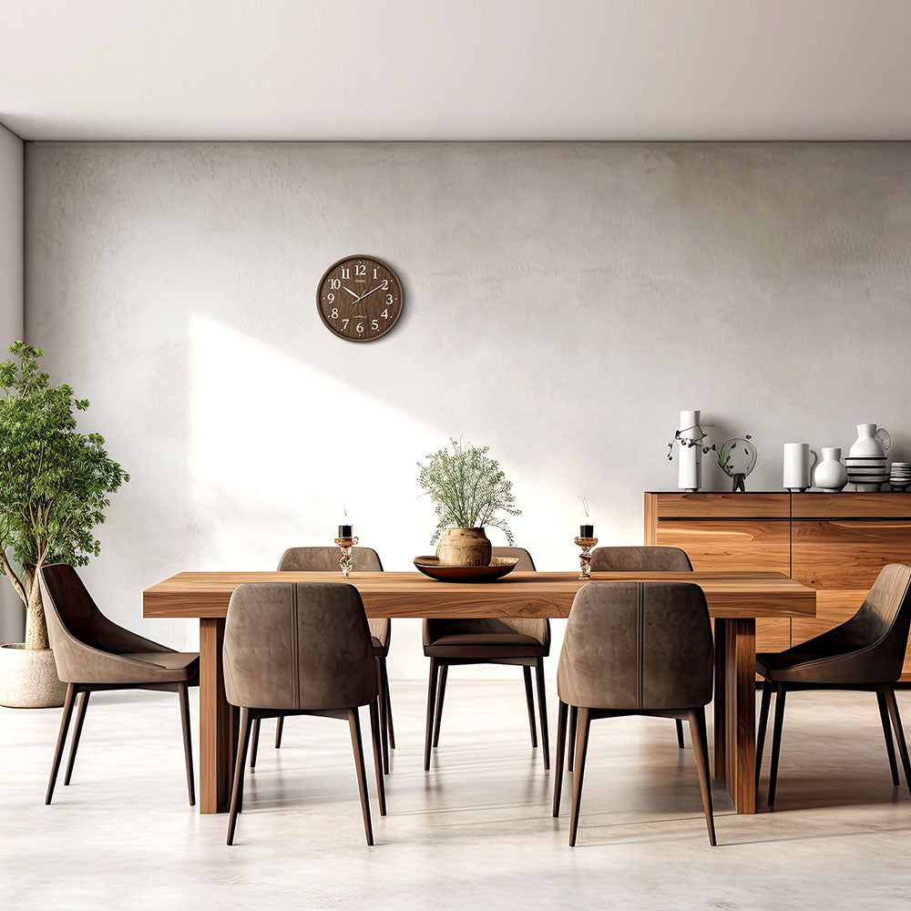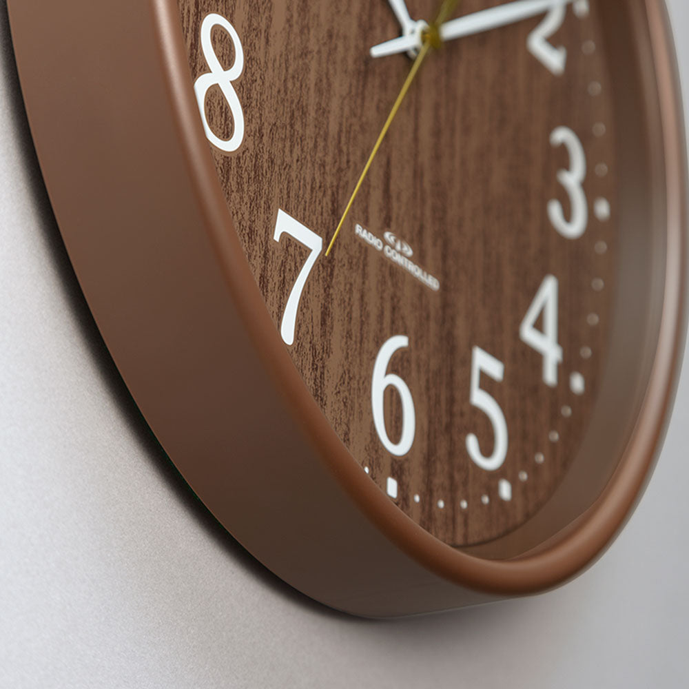 柔らかい形状の枠と木目調の文字板が安心感や温かみをもたらします。 落ち着いたダークブラウンがお部屋になじみやすい電波掛時計です。