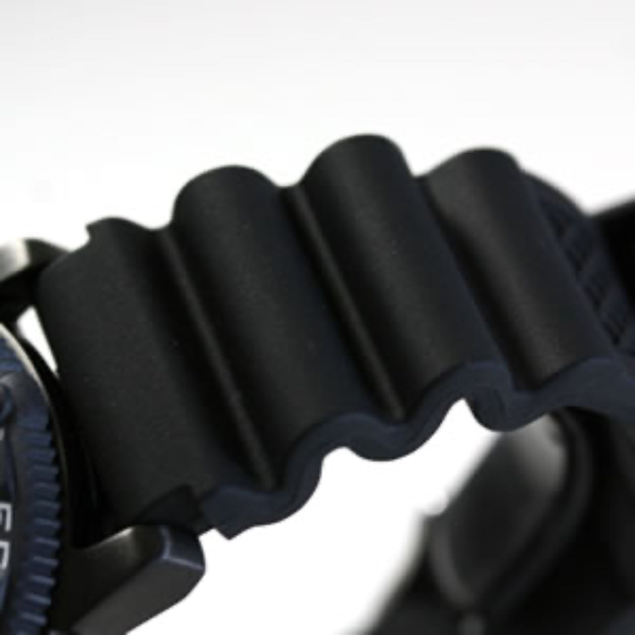 肉厚になっており、頑丈で馴染みやすいラバーベルトを使用。 水を全く気にせず、かつ時計の軽量化を成功させている。
