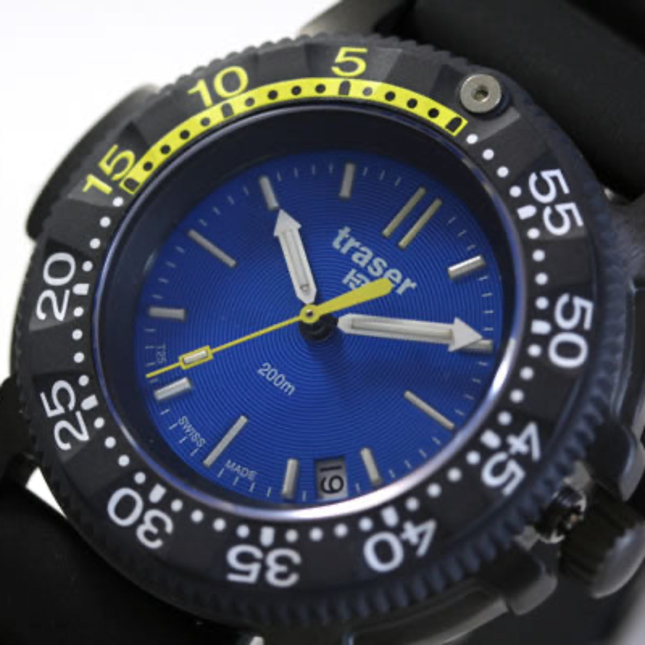 ブルーの文字盤が印象的なダイバーズモデル。レガッタのカウントダウンベゼルにイエローのアクセントが個性を出しているミリタリーダイバーウォッチ。