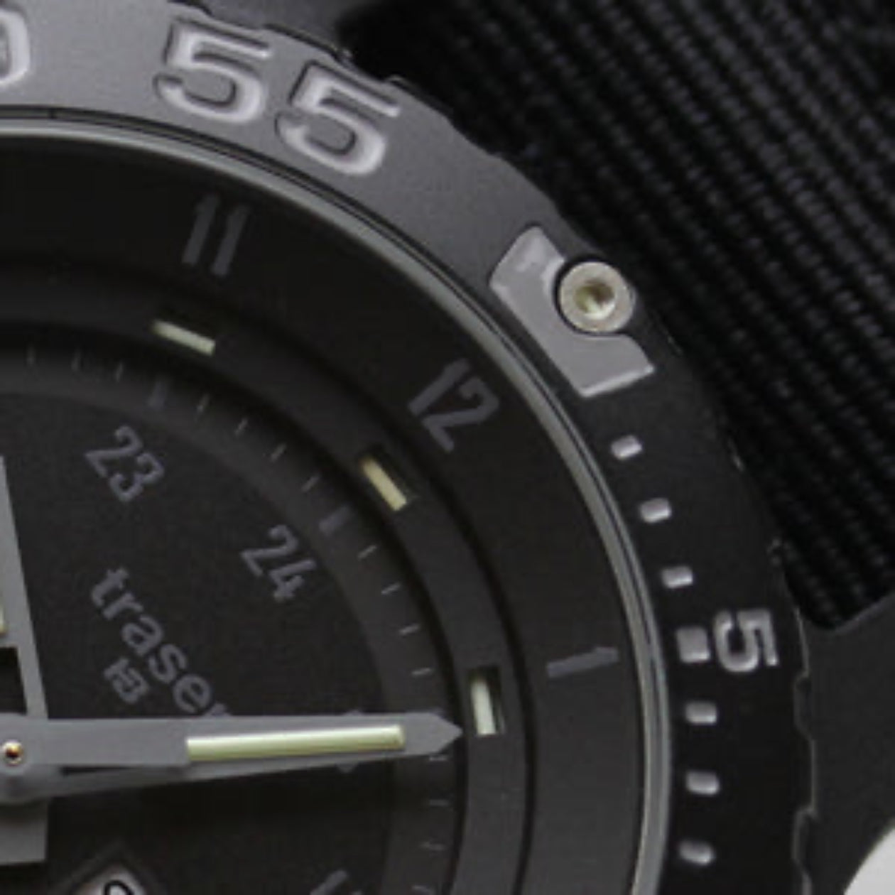 湾岸戦争や様々な暗闇でのミッションで立証された特殊発光"TRASER"システムは、小型ガラス・チューブにトリチウム・ガスを充填し、放射性物質を放出することなく、自己発光を可能にしたもので、従来の蛍光塗料と比べ実に100倍近い驚くべき視認性を確保するトレーサー 時計。