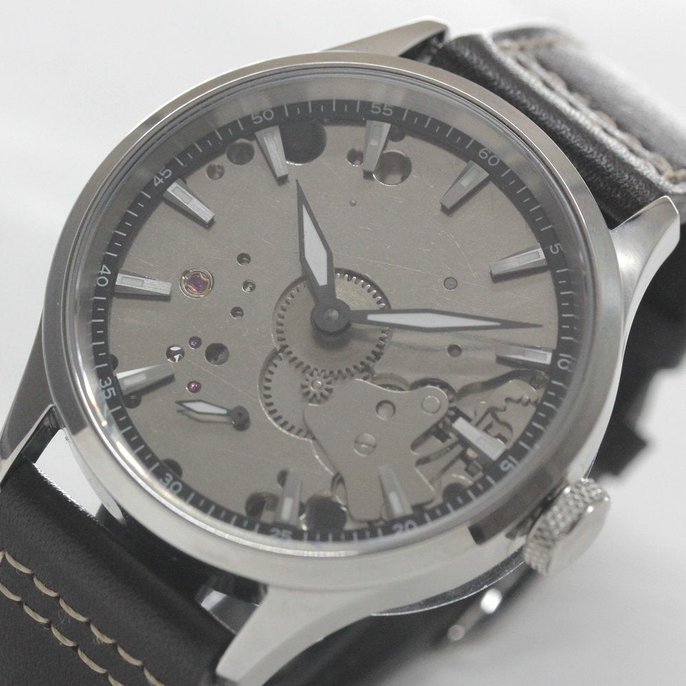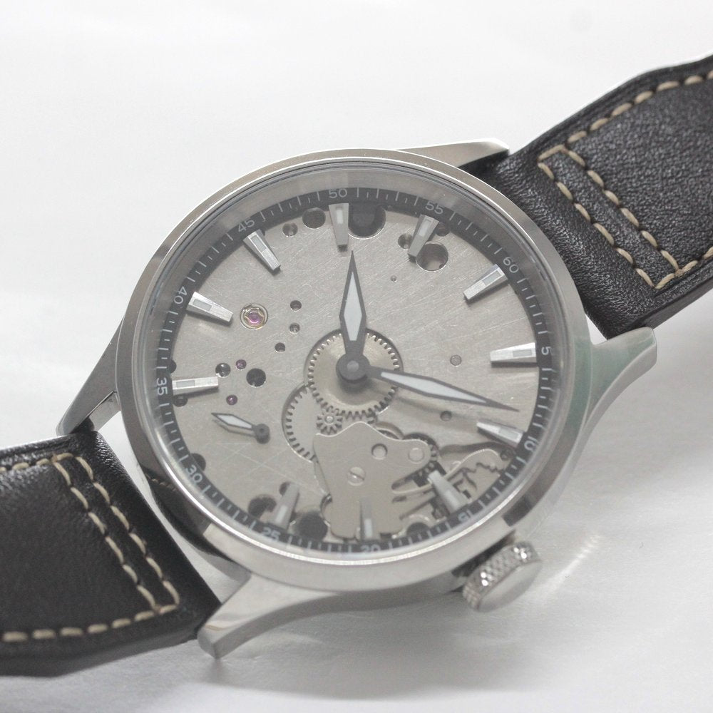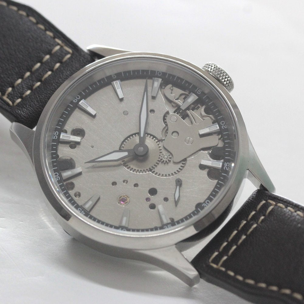 1970年代から現在までほぼ変わらず生産し続けられている、スイス製懐中時計の定番キャリバーである、ユニタス6498を使用しております。文字盤は目盛り以外を削ぎ落とし、ムーブメントがむき出しになったオープンダイヤル。