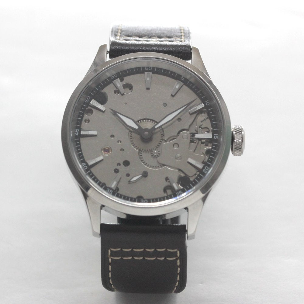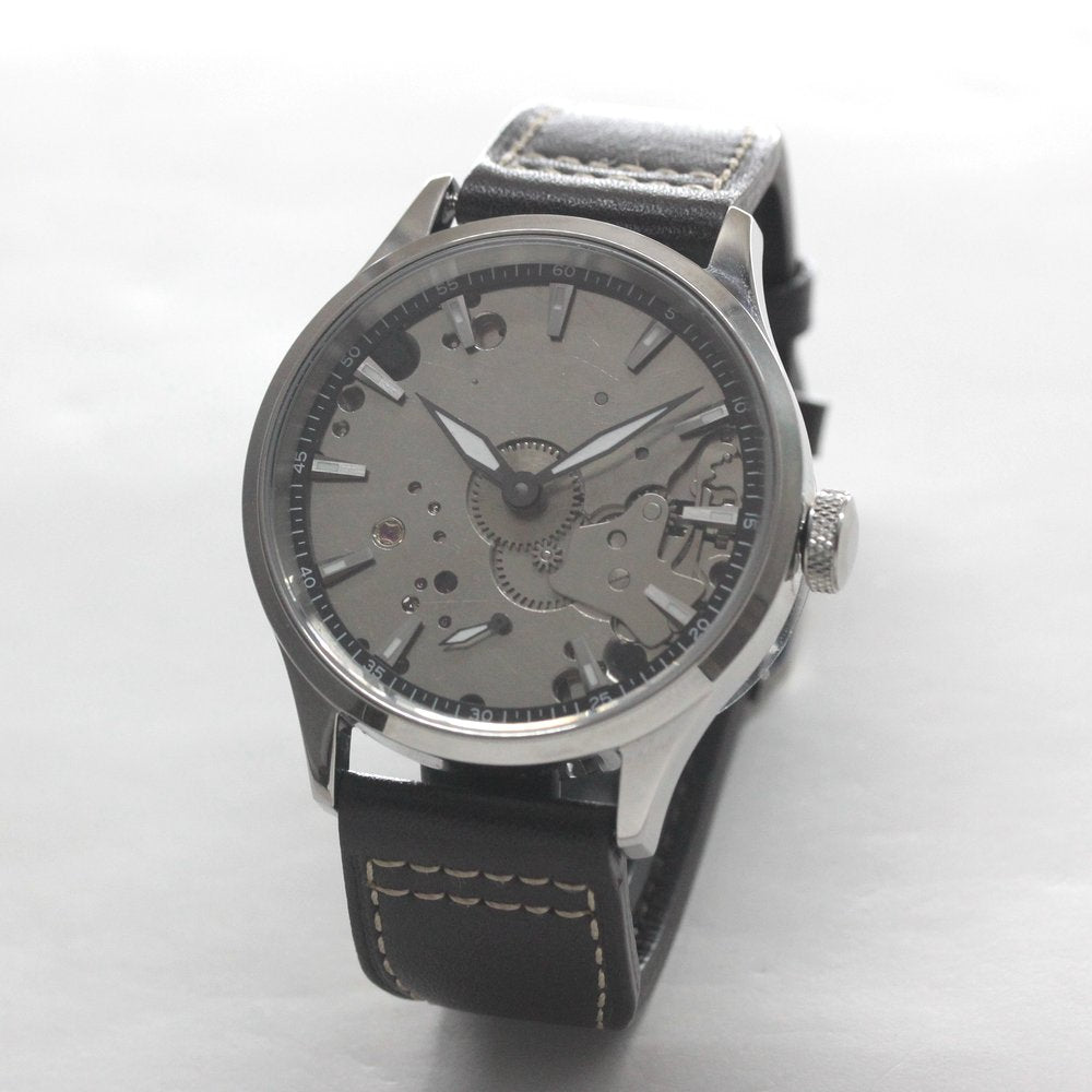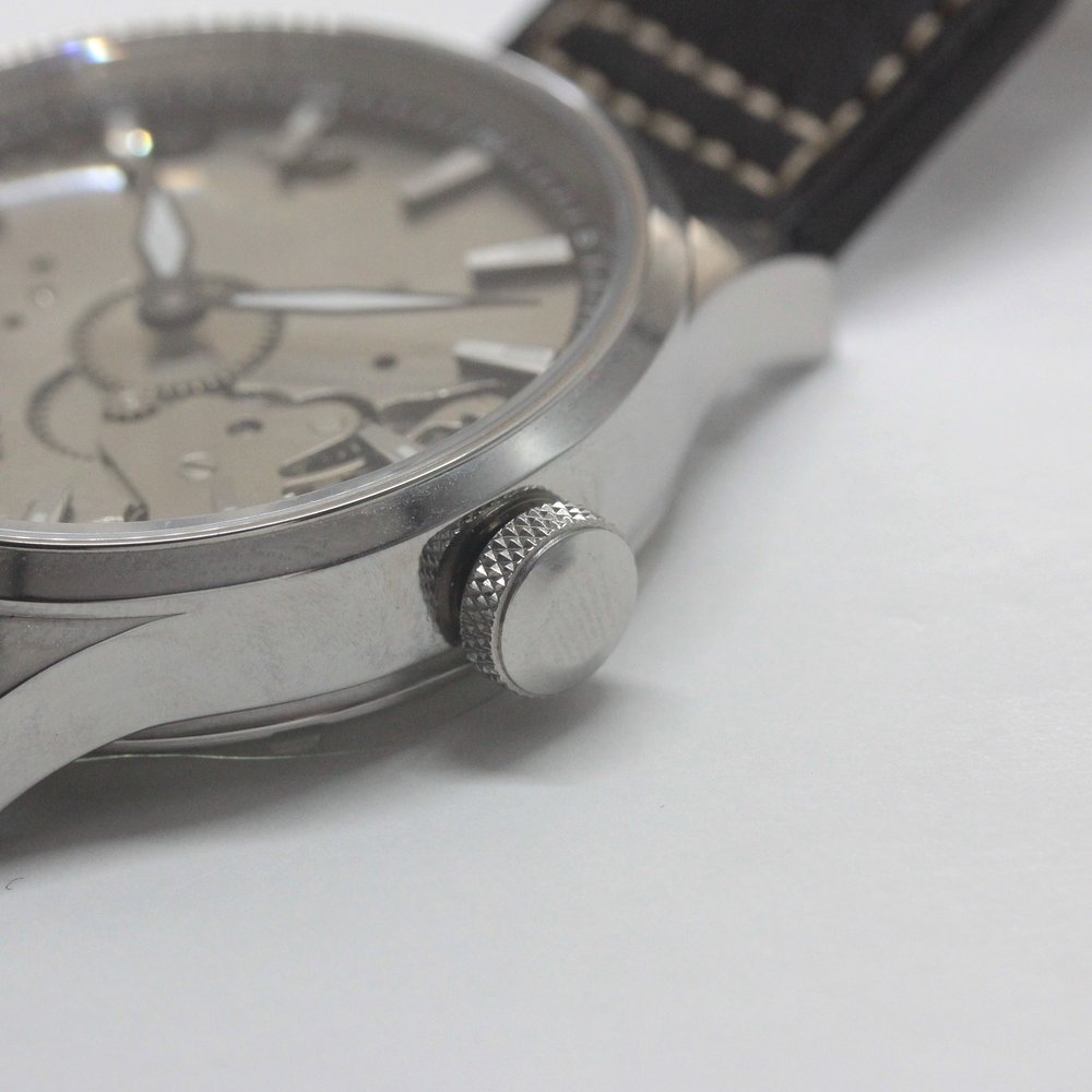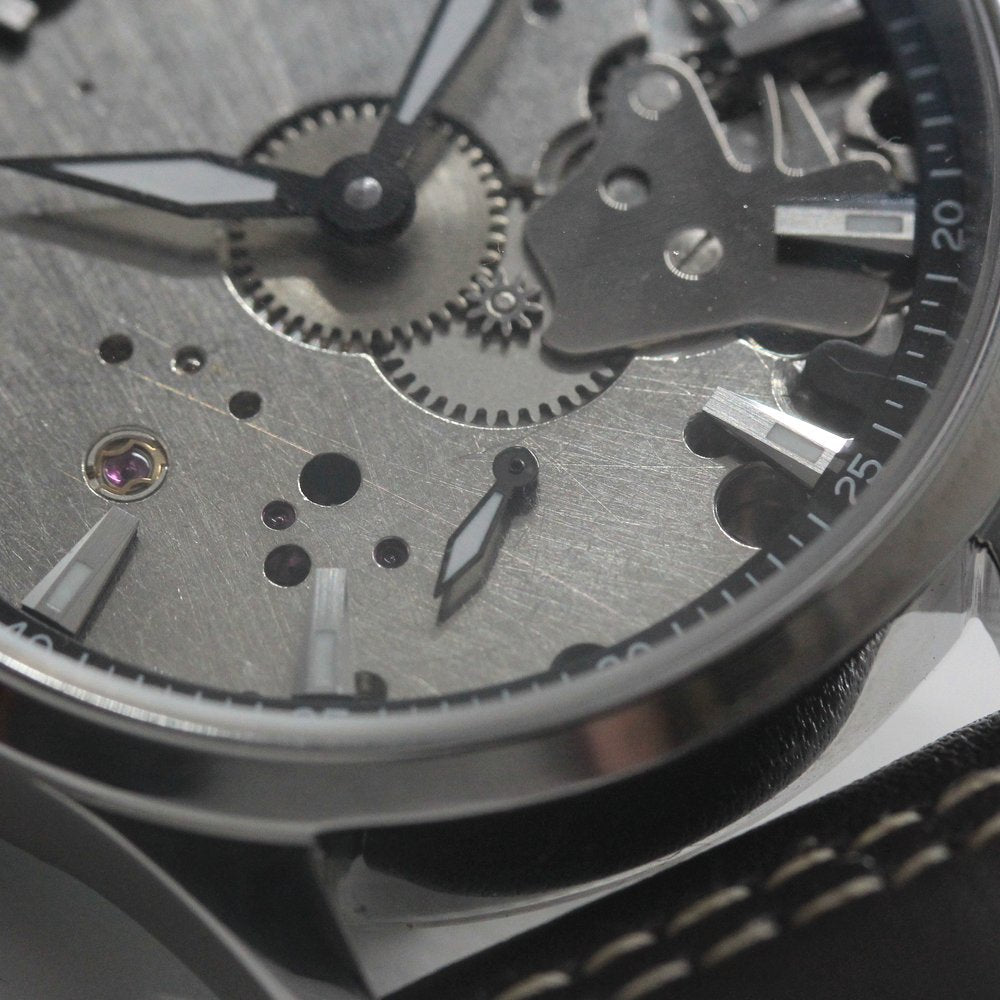 よくある「ブランドロゴ」は一切文字盤になく、機械が剥き出しで無骨なスケルトンウォッチに仕上がっています。