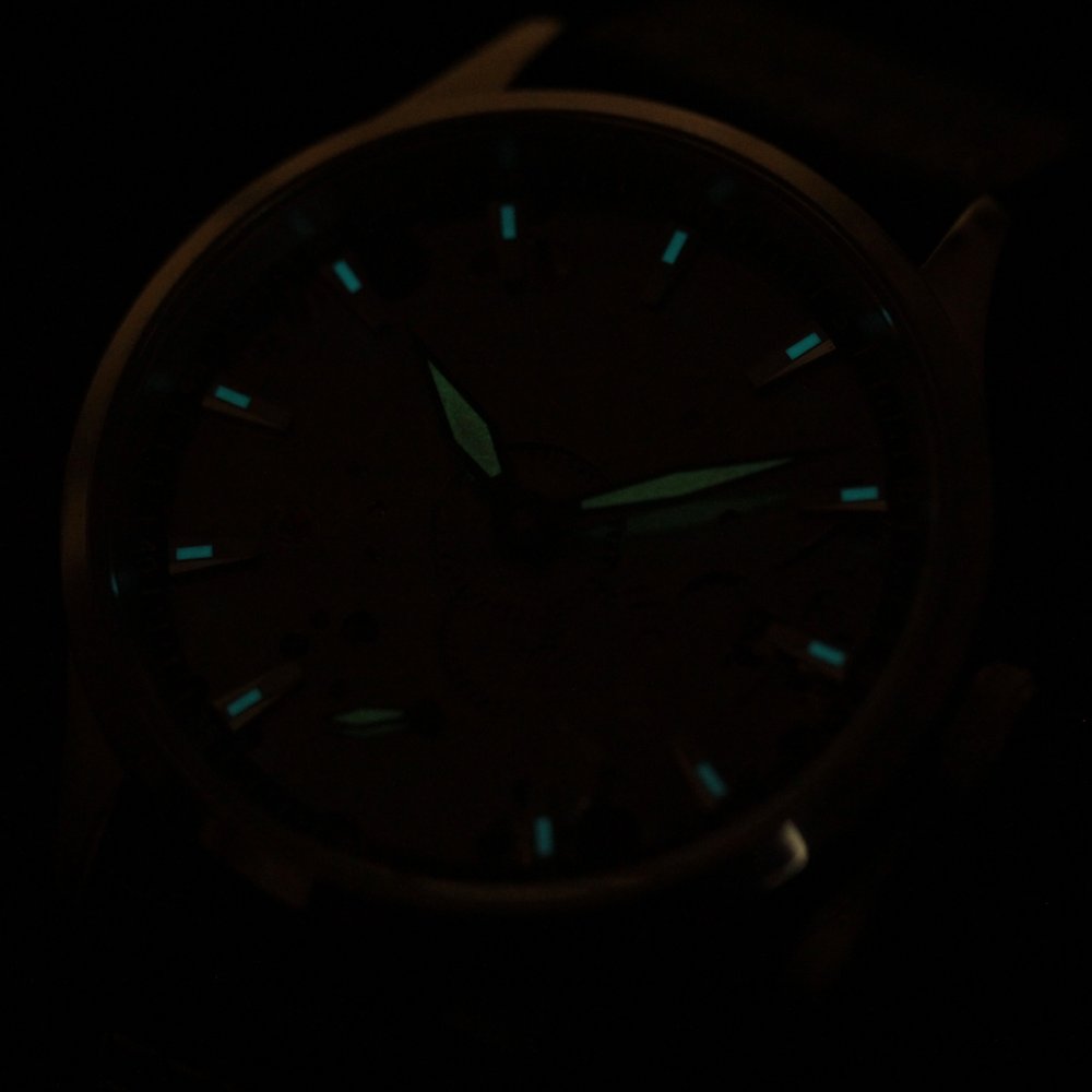 文字盤と針にはルミノバが塗布されており、太陽光や蛍光灯など明るい場所で蓄光し、暗いところで発光する、実用的な機能が備わっています。