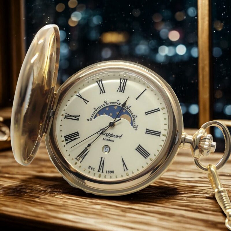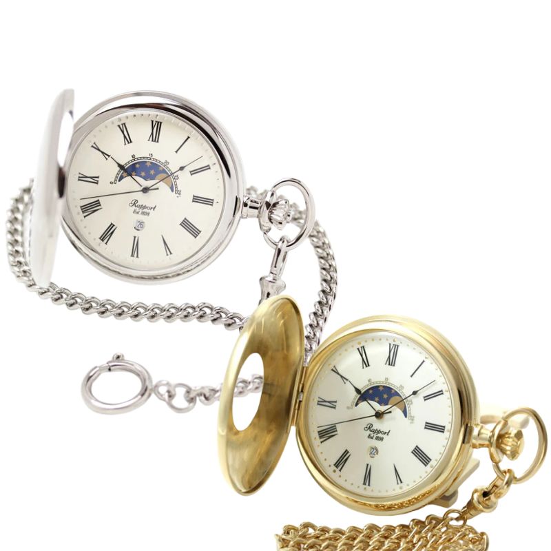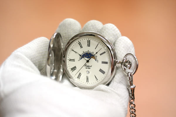 29.5日で1周するムーンフェイズ表示機能付きの「ラポート」ペア懐中時計