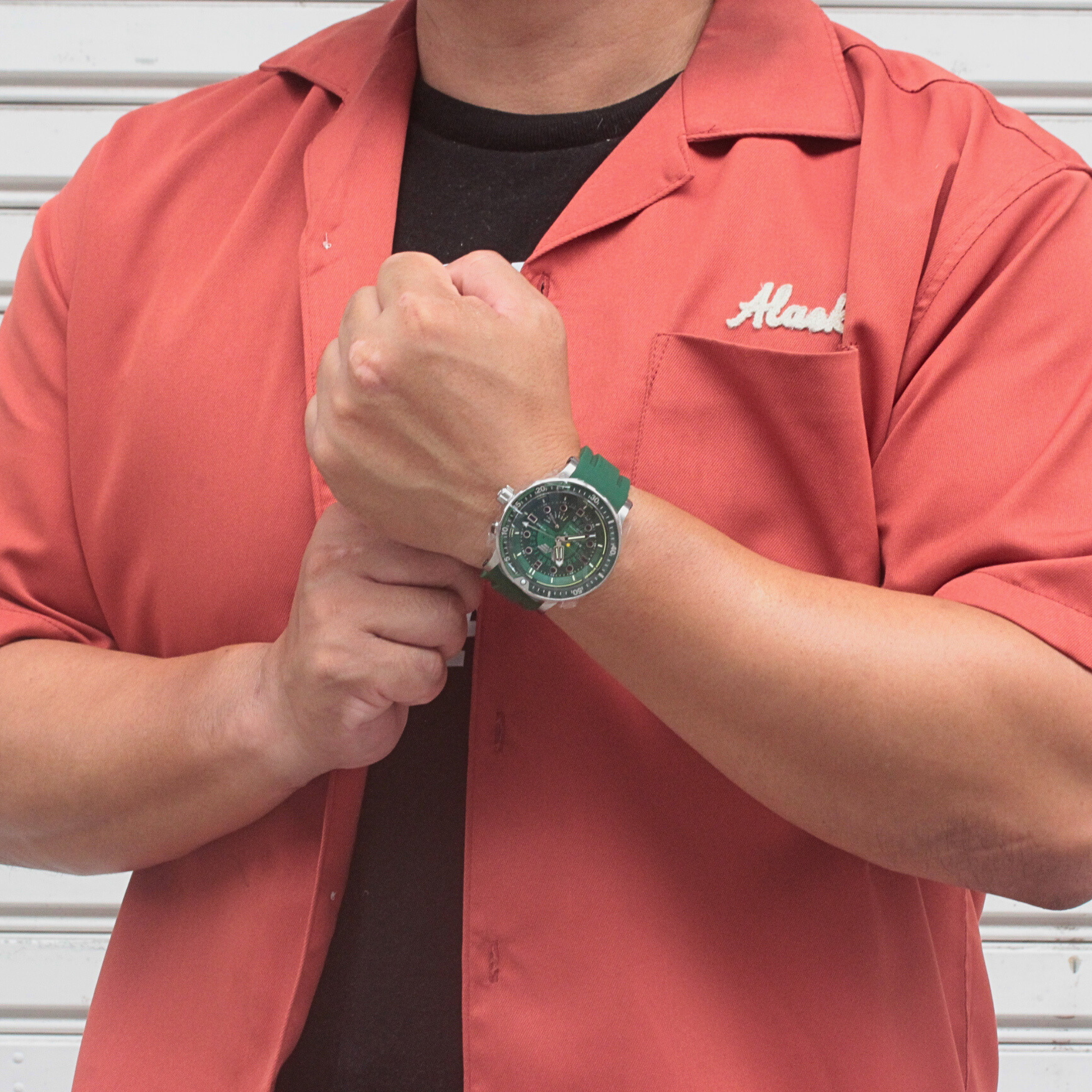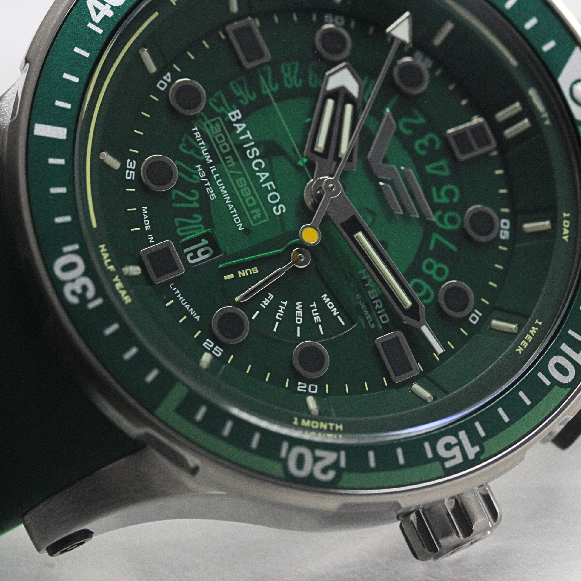PX84-511A770はハイブリッドムーブメントモデルとして、深海探査艇「バチスカーフ」にインスパイアされた堅牢な設計と、グリーンの印象的なルックスが特徴の1本です。