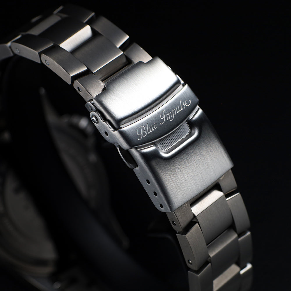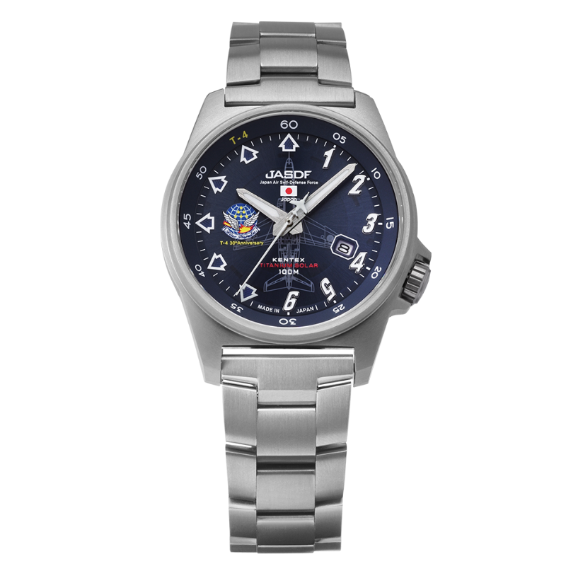 T-4機体にも使用される軽量かつ強靭なチタンをケースとブレスレットに採用し、日本製ソーラームーブメントと100m防水を備えた本格仕様。文字盤中央のT-4シルエット、5番機パイロットの“逆さの5”インデックスなど、ファン必見のディテールを随所に凝縮。秒針にはT-4機体をかたどった特別デザインを採用し、ダイヤル上に飛翔する機体の躍動感を表現しています。