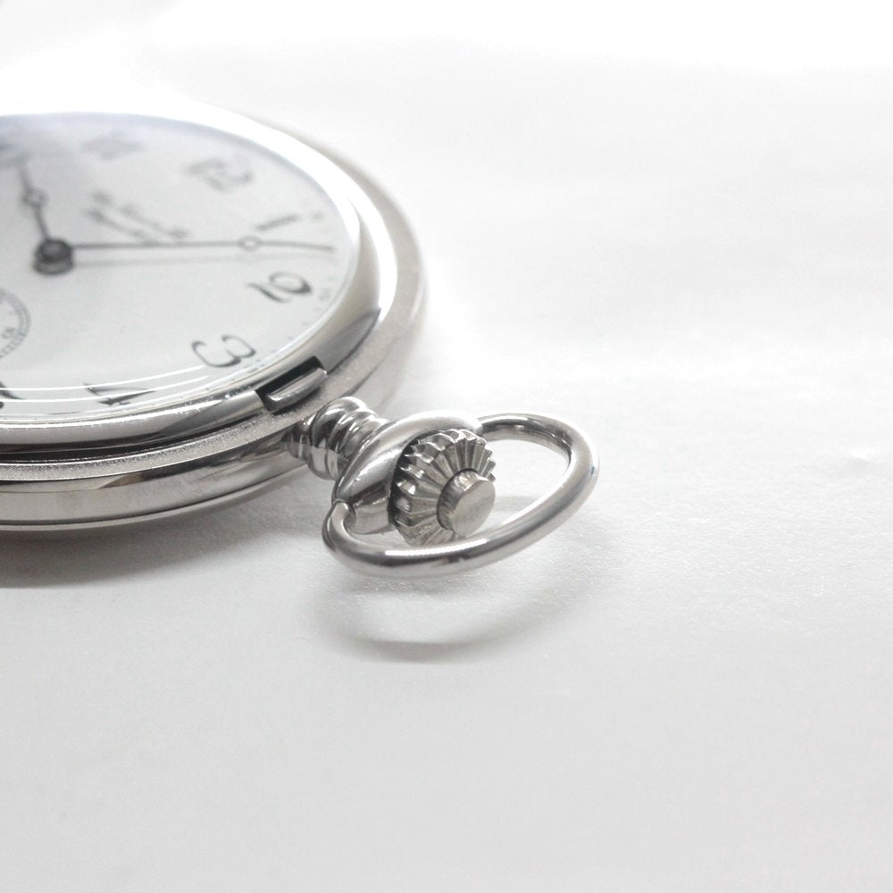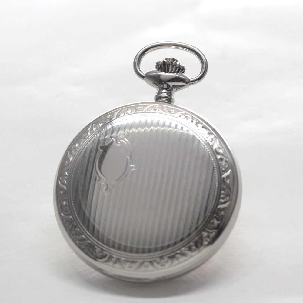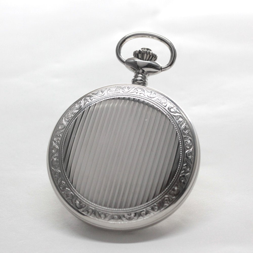日本人に最も見慣れた数字のアラビア数字文字盤、ストライプ模様が刻印されたケースが特徴的な懐中時計。