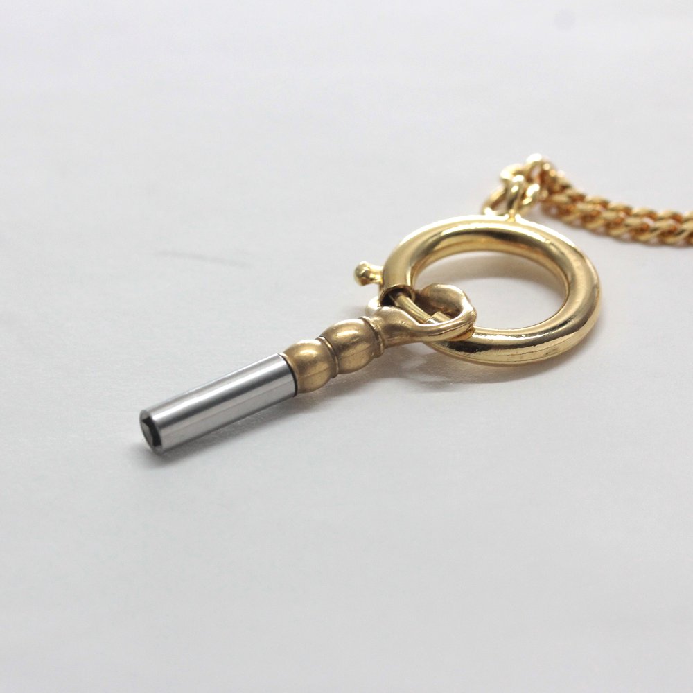 昔ながらのローマン数字文字盤、古典的な模様が刻印されたケースは個性的で、付属の鍵型の突起物をムーブメントに差し込みゼンマイを巻き上げる鍵巻き仕様。